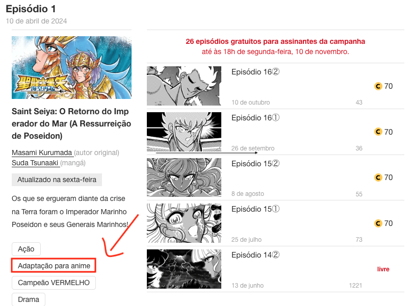 A especulação ganhou força após a editora japonesa Akita Shoten disponibilizar os capítulos do mangá Rerise of Poseidon em sua plataforma digital, Champion Cross, com uma campanha especial de 72 horas de acesso gratuito. O detalhe que mais chamou a atenção dos fãs foi a inclusão da tag “adaptação para anime” — um indicativo que até agora só havia sido usado em Saintia Shô e The Lost Canvas, ambas obras que de fato receberam adaptações animadas. Veja: