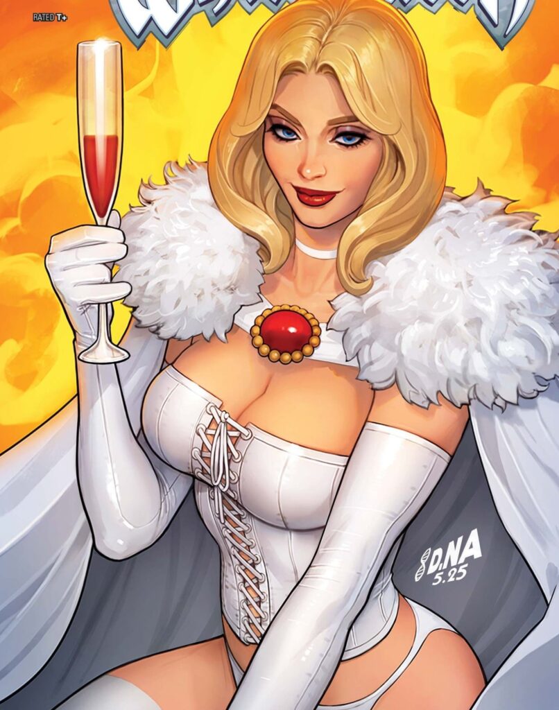 Nos quadrinhos, Emma Frost começou sua trajetória como a vilã Rainha Branca do Clube do Inferno, utilizando uma persona sofisticada e manipuladora. Com o tempo, a personagem passou por uma redenção significativa, tornando-se aliada dos X-Men e assumindo um papel de liderança na Escola Xavier ao lado de Ciclope, com quem desenvolve um relacionamento marcante.
